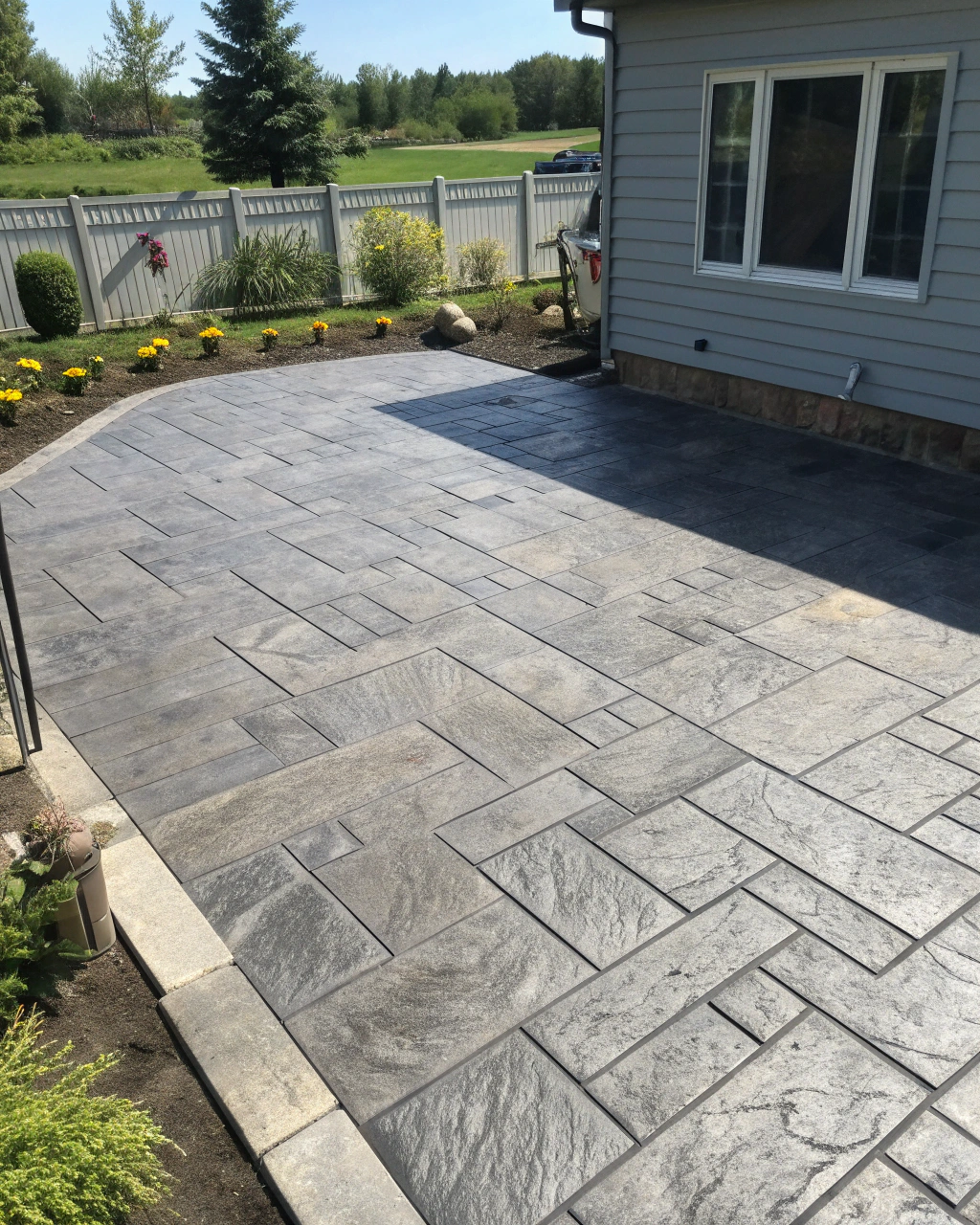 Our stamped concrete proves more durable than actual pavers because there’s no movement, sinking, or weed growth between individual pieces. The seamless surface makes cleaning easier with simple pressure washing compared to maintaining gaps and joints in traditional pavers.